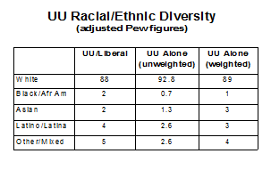 Mormons are sometimes held up as the epitome of religious whiteness,25 but the Pew findings show that they are slightly more diverse than Unitarian Universalists. Something to ponder.