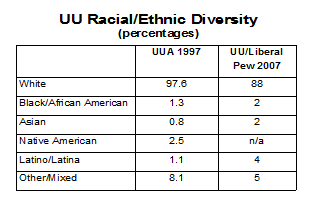To put this a bit differently: If you were asked by a colleague in another faith about the racial and ethnic diversity within Unitarian Universalism, what would you say? “Beats me,” is one possibility. Or, you might have a general impression; you might say, for example, “well, I’d guess that we’re about 90%white.” But if you wanted to verify your impression or discover how much we have changed over the past decade, where would you look? Whom would you ask? I tried to do this as I was preparing for this talk, and what I discovered is that nobody knows. We simply do not collect the data that could tell us how we are doing. When it comes to our own racial and cultural identity, our policy seems to be “don’t ask, don’t tell.” I find this both troubling and puzzling in light of our commitment seventeen years ago to create a “racially diverse and multicultural Unitarian Universalism.”8
