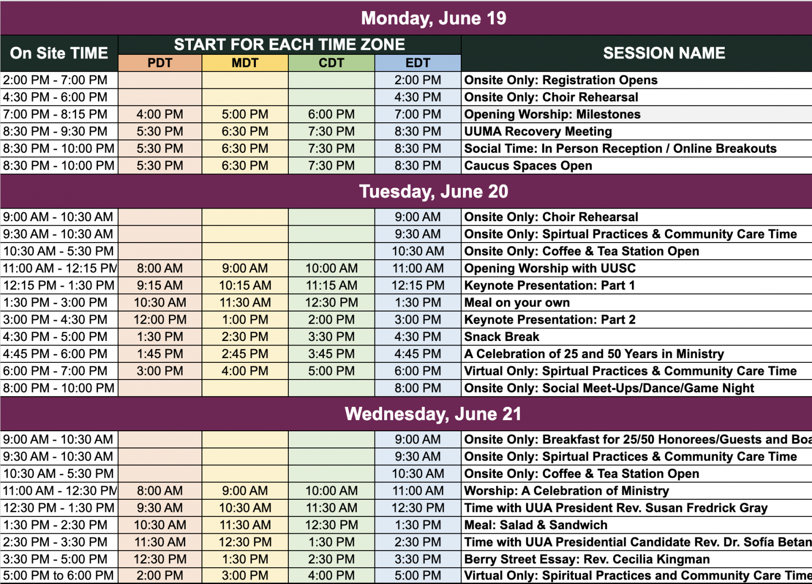 Caucus Space and Sensory Space: There will be dedicated caucus spaces for our BIPOC, Trans/Non-Binary and Disabled attendees as well as a meditation/sensory break space if you need somewhere to decompress. These spaces can be found on the map of the convention center and will be open any time the UUMA is hosting programming.